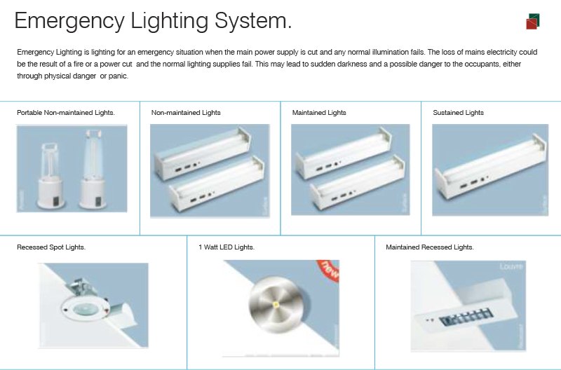 Emergency Lighting is lighting for an emergency situation when the main powder supply is cut and any normal illumination fails. The loss of mains electricity could be the result of a fire or a powder cut and the normal lighting supplies fail. This may lead to sudden darkness and a possible danger to the occupants, either through physical danger or panic.