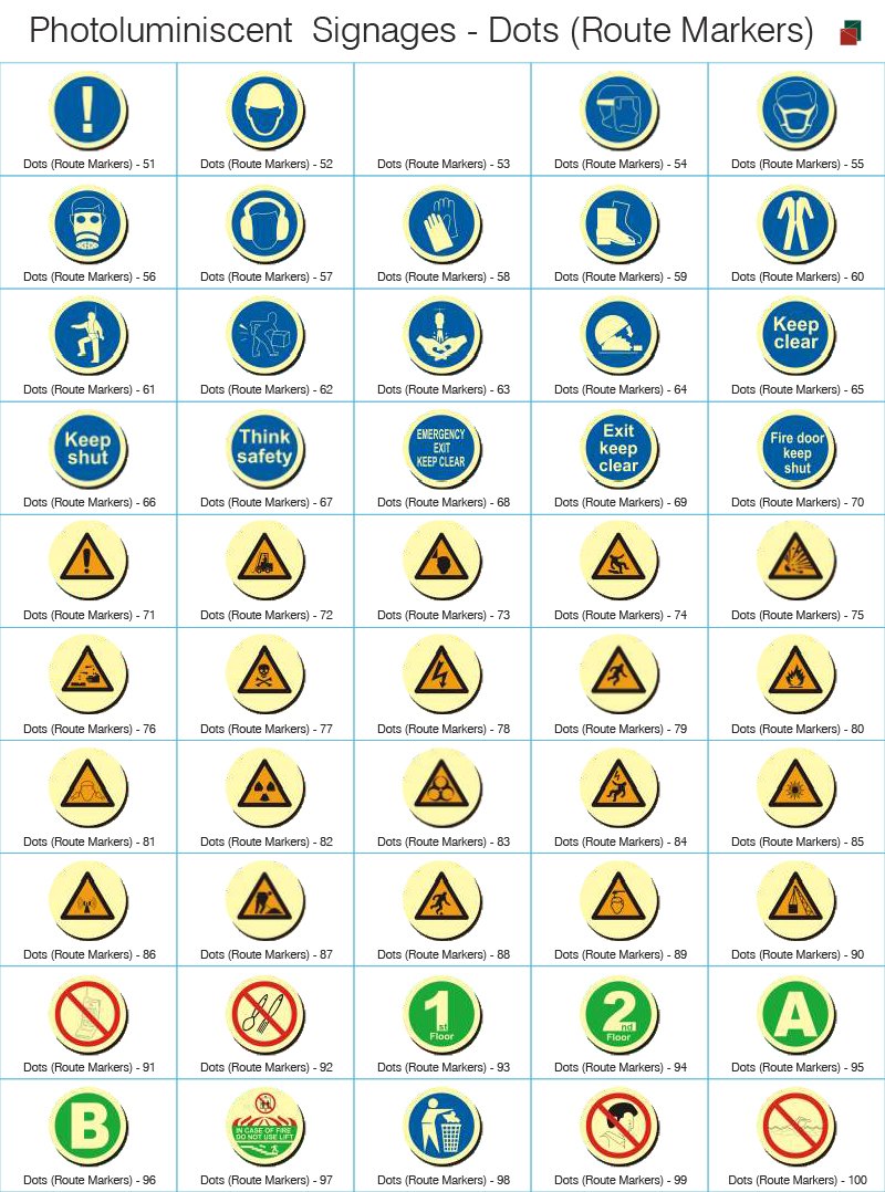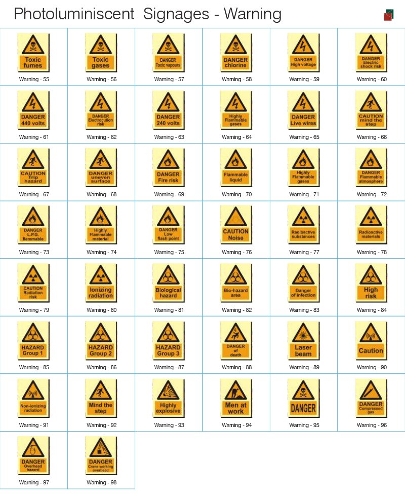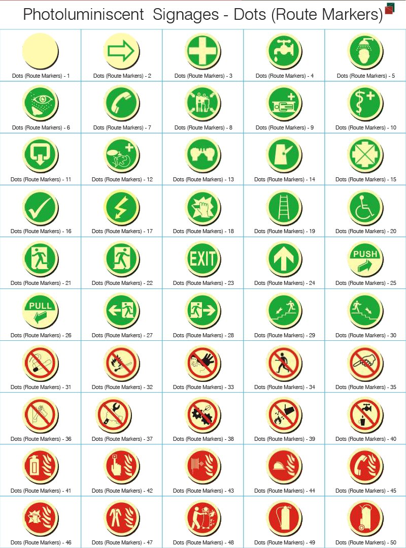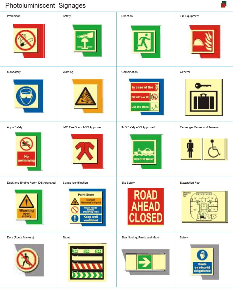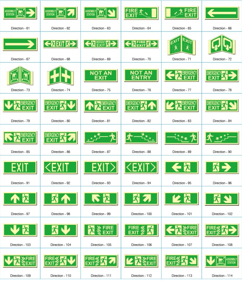 This comprises of a photoluminiscent material which emits a clear and visible glow when there is power failure and total darkness. The material requires no battery powder or any other trigging source of emission of a glow. On exposure to light, natural or artificial , it absorbs and stores light energy and then absence of light , this captivated light is released to give of luminous glow by its non toxic chemical. All the signs are made and designed as per national & international standards. Customized designs to customer requirement available in any language , size or matter on request